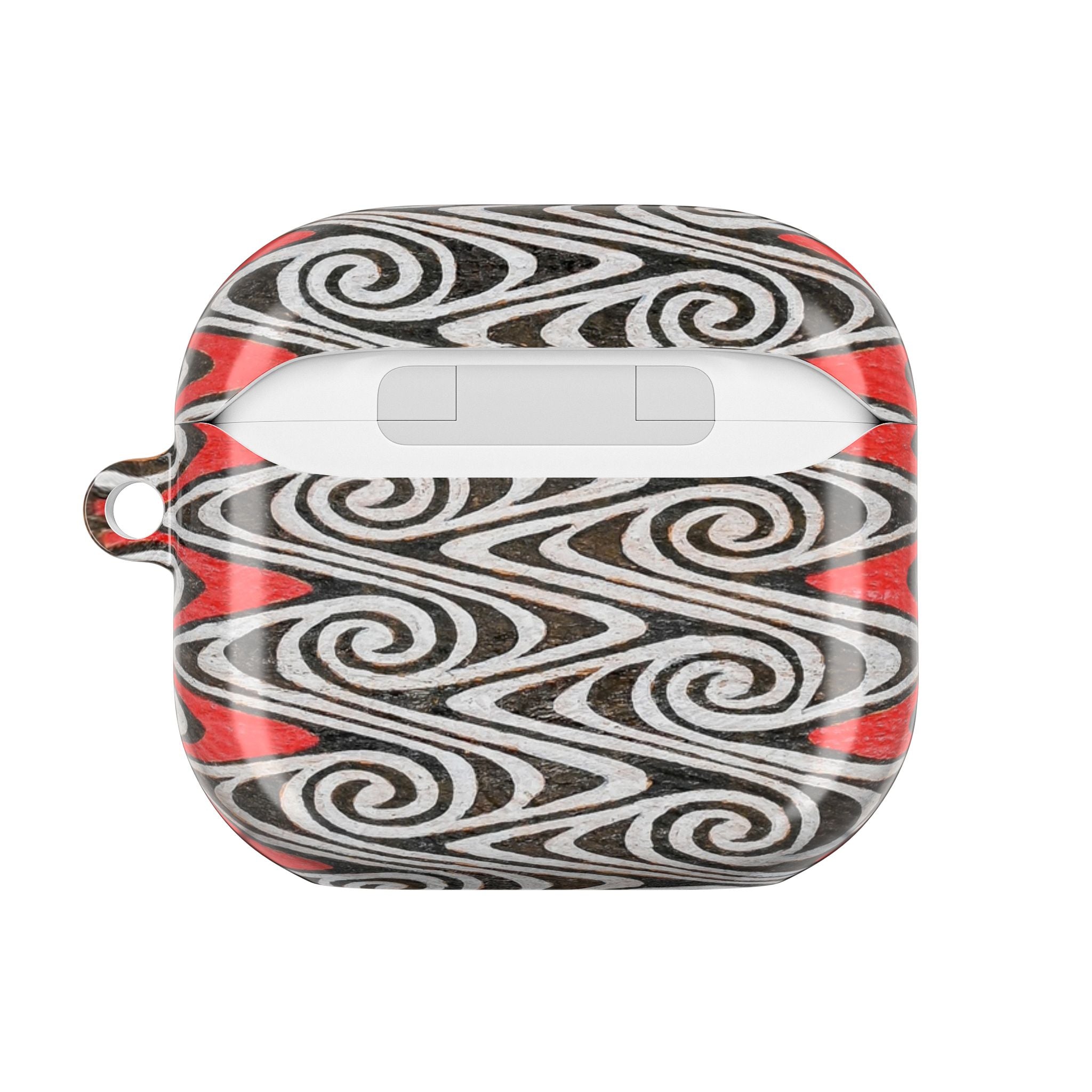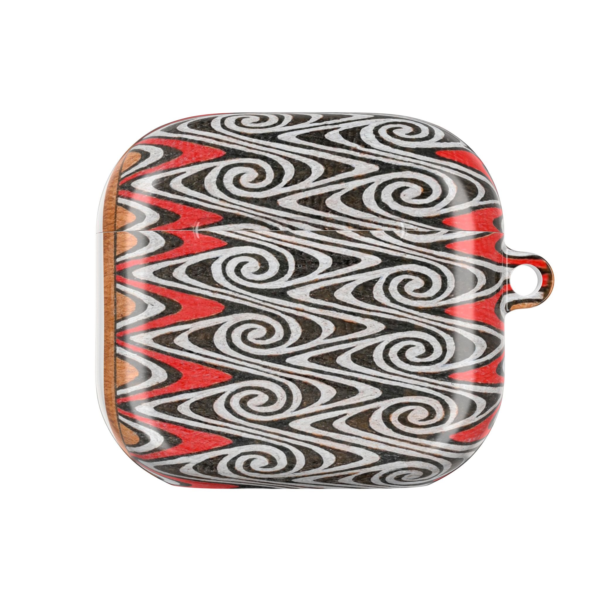 Een slanke, glanzende AirPod-case die een gedurfde, dynamische uitstraling geeft aan je dagelijkse spullen. Het wervelende Waves of Ancestry, handgetekende golfpatroon in zwart, wit en rood creëert beweging over het oppervlak.